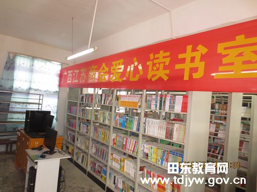 今年年初,广西江苏商会殷副会长一行5人再次深入我校考察,他们看到我校图书室设备简陋,书籍不全等情况后,慷慨捐资完善我校图书室建设。到目前为止,捐赠高级精美书架5套,书籍1678册,电脑2台,价值近伍万元。这些物资大大完善我校图书室建设,为我校师生拓展了阅读空间。莫廷武校长表示将加强图书室的管理力度,让这些优质的资源为我校师生服务