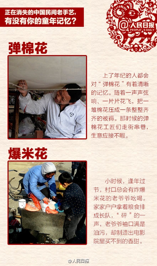 正在消失的民间老手艺,有没有你的童年记忆?早年间,街头巷尾的手艺人貌不惊人却身怀绝技,手中辗转腾挪,制出金灿灿的糖人;修编剃刮,修面师傅让人焕然一新;“砰”地一声,爆米花爷爷做出电影院买不到的香甜……随着时代发展,许多老手艺已经渐渐消失了,只留在记忆里。你还记得哪些?